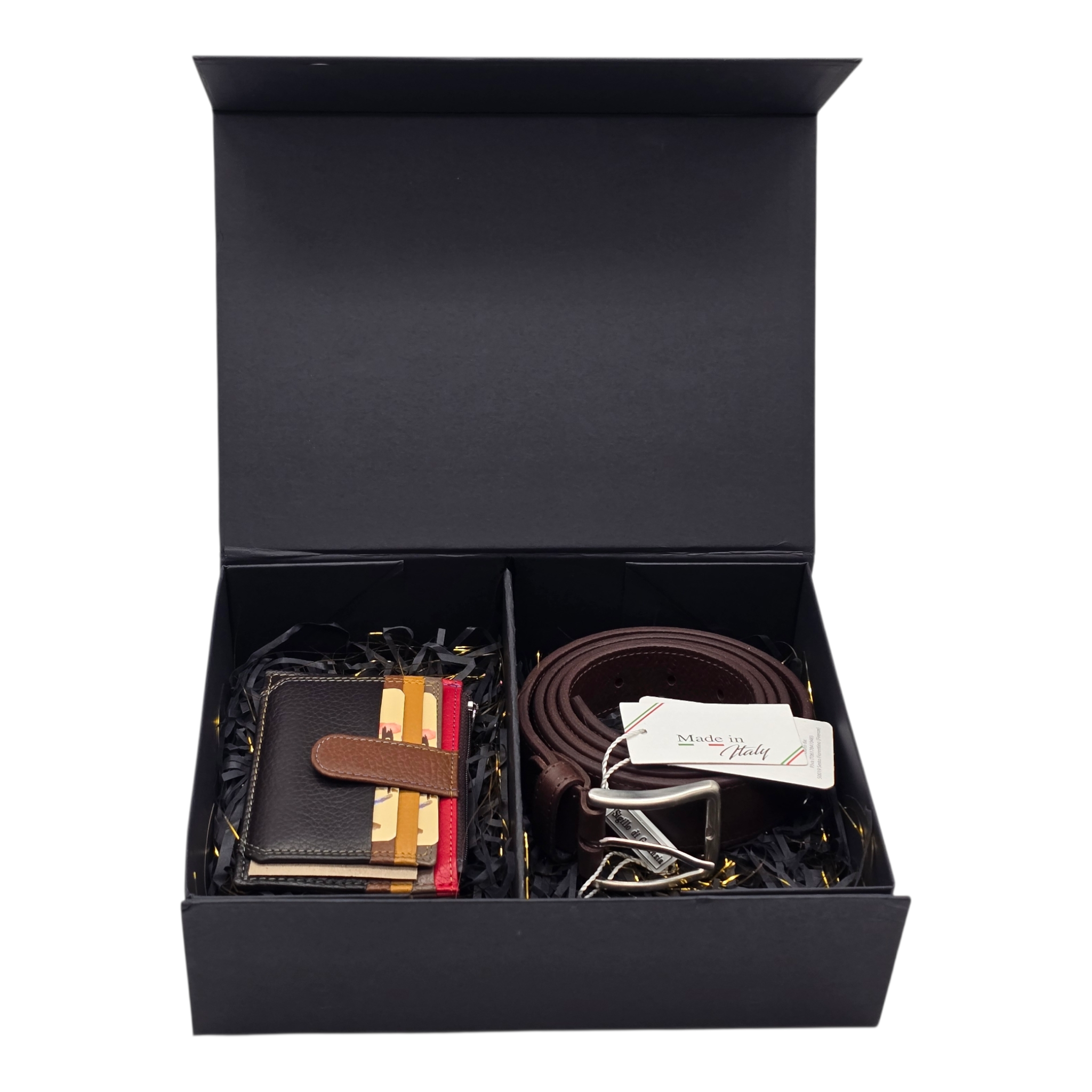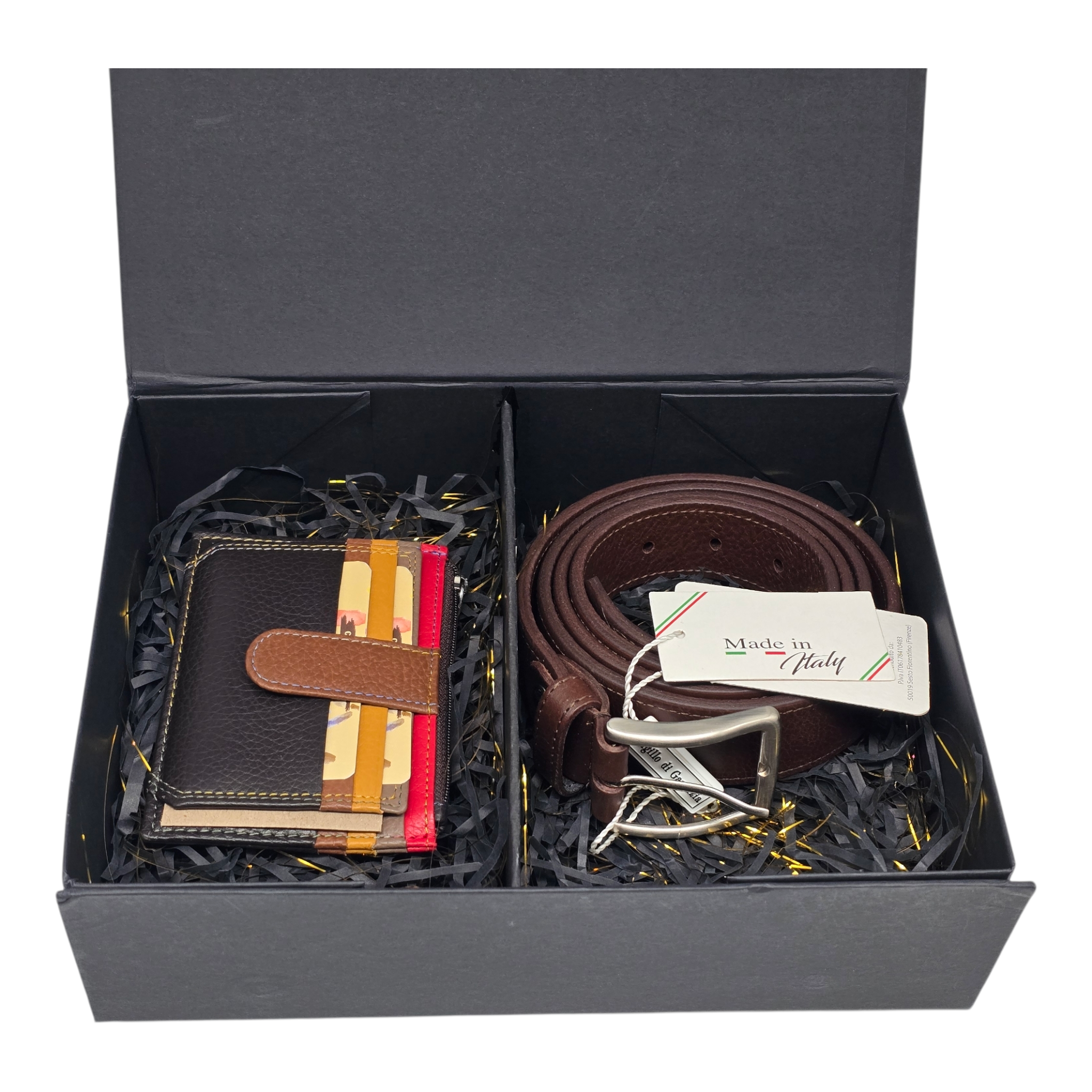 Deze stijlvolle heren-giftbox biedt een verfijnde combinatie van functionaliteit en elegantie. De set bevat een hoogwaardige leren riem en een compacte kaarthouder/portemonnee, zorgvuldig verpakt in een luxe Elodina cadeaubox. Een perfect geschenk voor iedere man die kwaliteit en klasse waardeert.