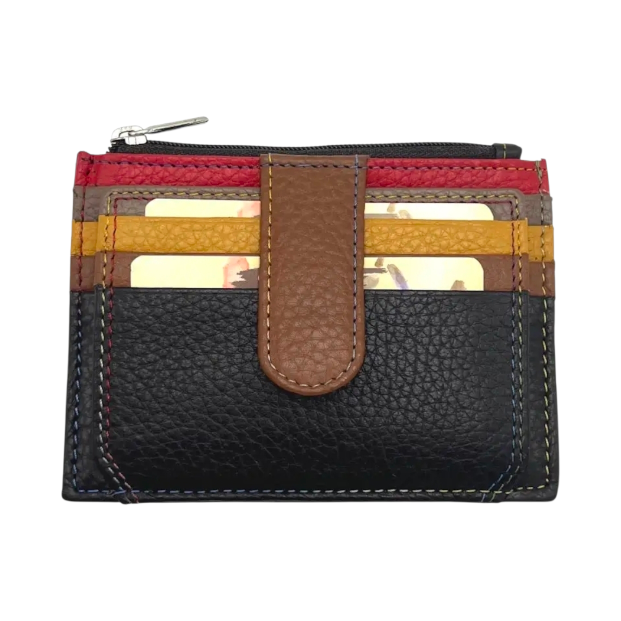 Kaarthouder / portemonnee: 12 × 8,5 × 1 cm — meerdere kaartsleuven — ritssluiting boven