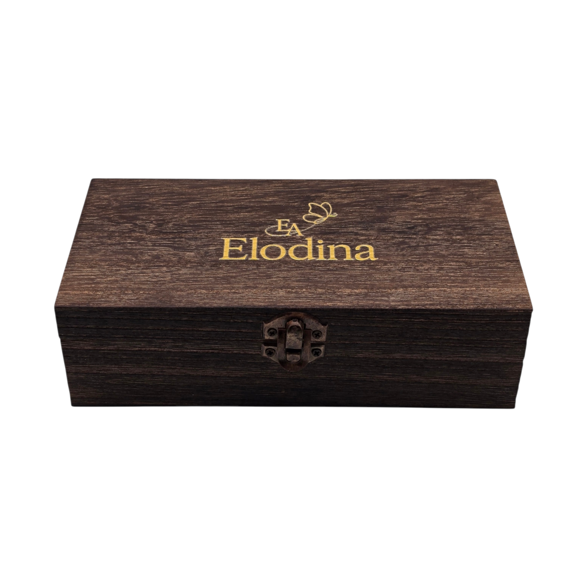 Giftbox: Houten premium doos — afmeting 20 × 10 × 4 cm — luxe binnenzijde met Elodina-logo