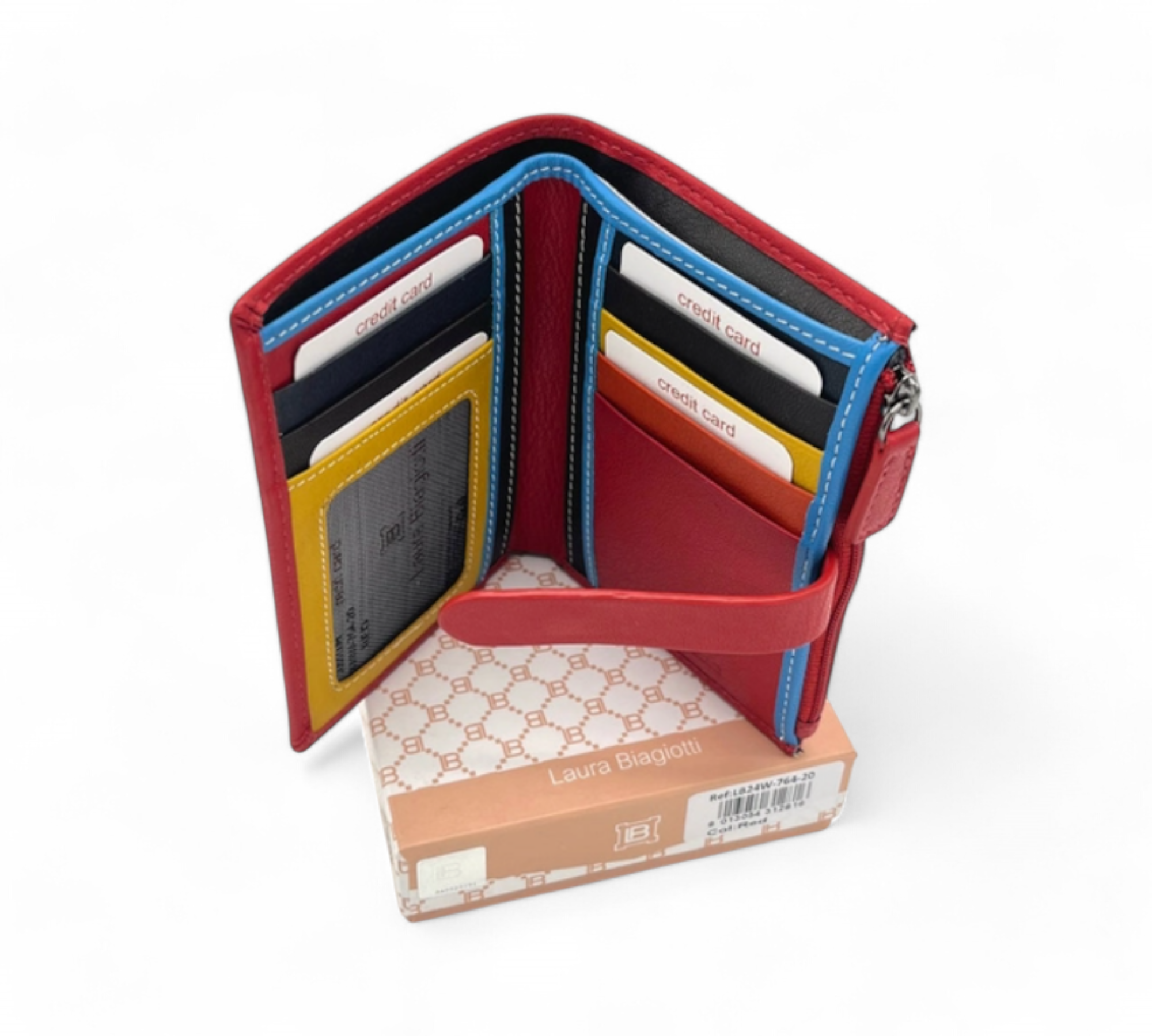 Compacte en kleurrijke portemonnee van Laura Biagiotti. Perfect georganiseerd met ruimte voor pasjes, muntjes en briefgeld. Voeg een vleugje stijl...