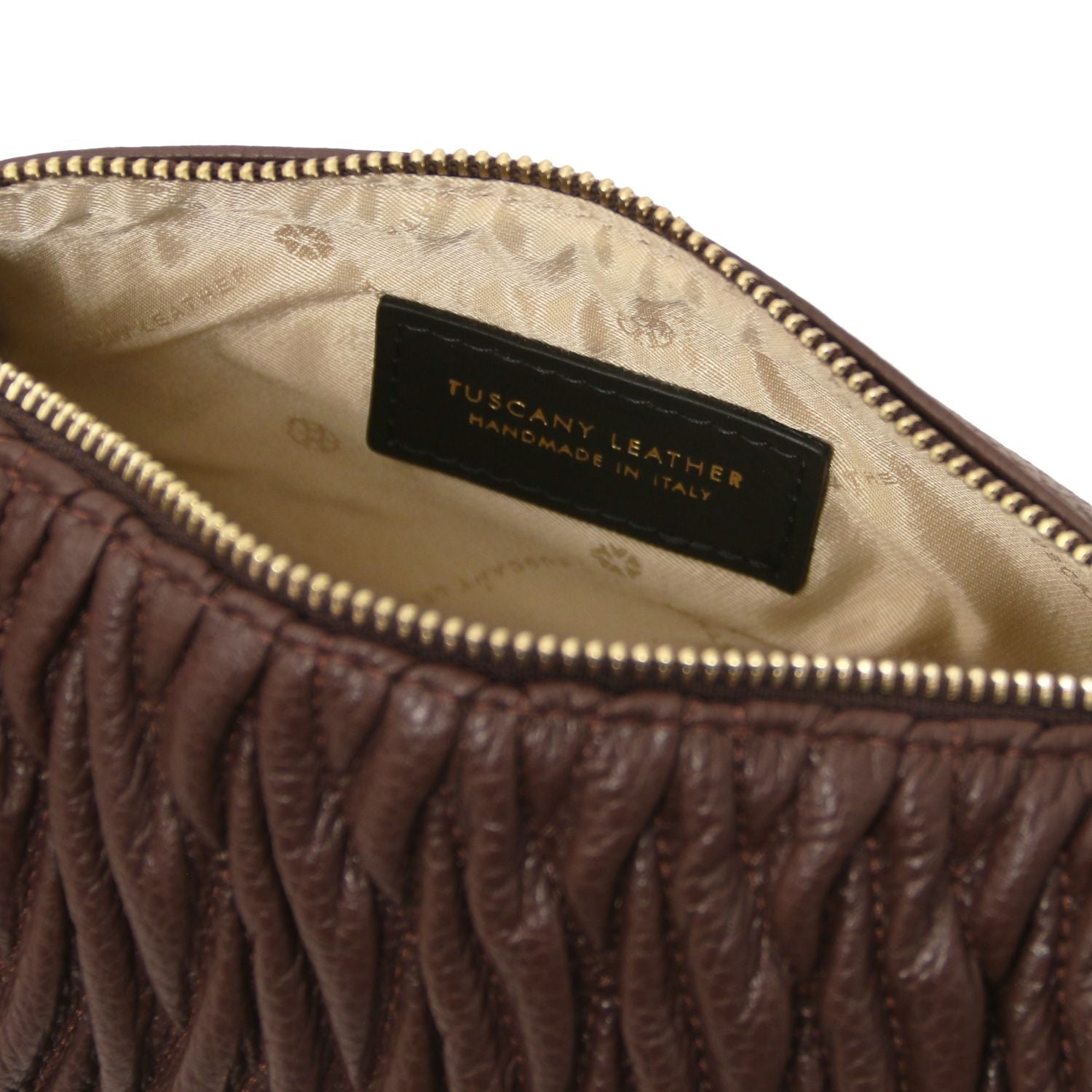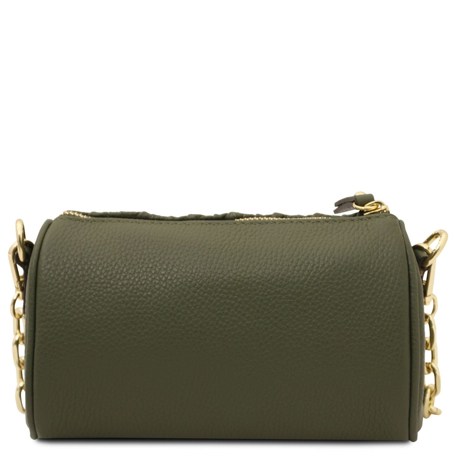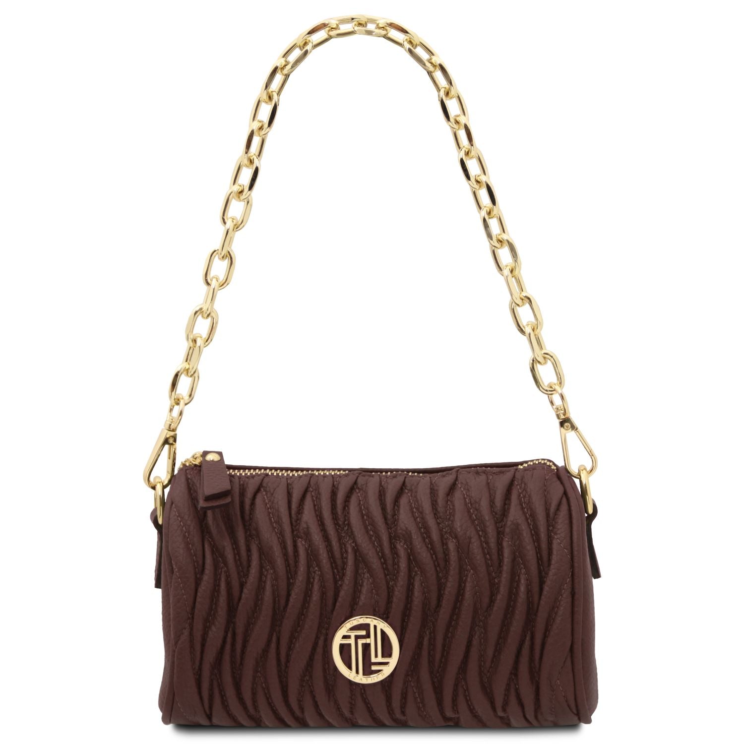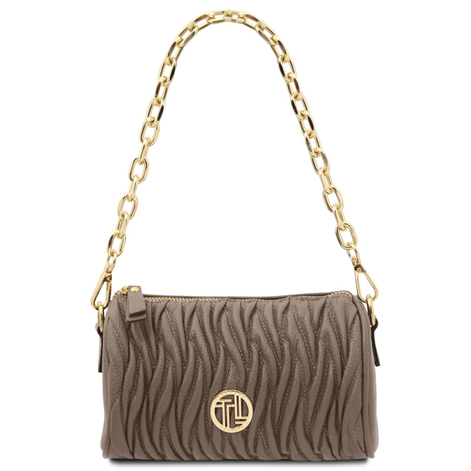 Compact, chique en 100% Italiaans. De Chantilly bag van Tuscany Leather is een verfijnde mini bowlingtas, handgemaakt van hoogwaardig gekorreld leer. Met haar elegante vorm, goudkleurige kettinghandvat en verstelbare schouderriem is dit de perfecte tas voor zowel overdag als ‘s avonds.